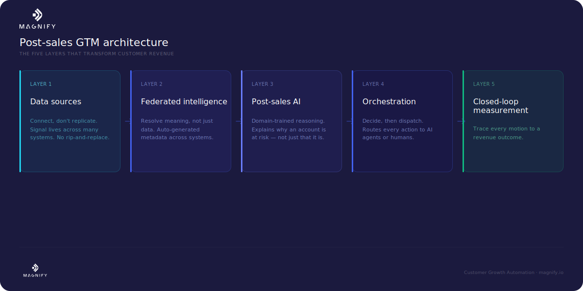 Post-sales GTM is being rebuilt from the ground up, and bolting AI onto legacy CS tools won't get you there. This whitepaper breaks down the five-layer GTM AI architecture rebuilding how enterprise companies drive renewals, retention, and expansion, allowing CCOs, CROs, and CIOs to turn post-sales from a cost center into the highest-margin growth engine in the business. Companies that move quickly will build a compounding lead and keep up with AI native challengers.